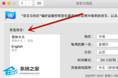 1、 点击系统偏好设置,找到语言与地区。