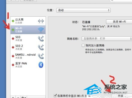 3、选择点击左边的“互联网”,然后选择右边的wifi,如果右边不是显示的wifi而是airport就选“airport”。