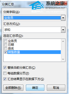 【数据】-【分类汇总】,分类字段选择【业务员】,点【确定】。