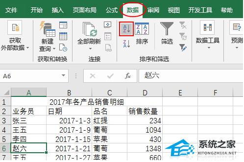 点业务员数据列中任意单元格,在【数据】选项卡下【排序和筛选】组中选择【升序】。