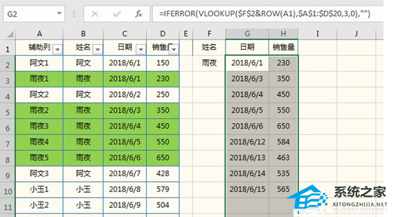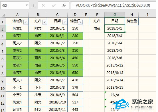 公式中函数 Row(A1) 返回A1所在的行号,作用是给查询值加上一个序号,比如:F2为雨夜时,公式下过程中查找值变成了找雨夜1、雨夜2。。。实现了每行查询的都是唯一值。