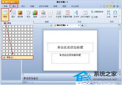 首先打开wps演示,在菜单“插入”-“表格”中点击“自定义表格”按钮,如下图1所示: