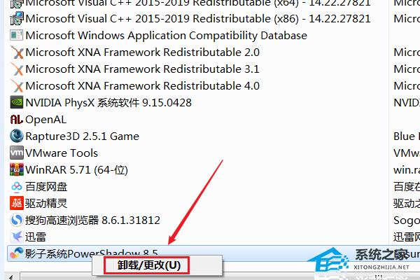 4、在打开的程序和功能窗口中找到影子系统软件,在弹出的列表中选择卸载/更改即可。