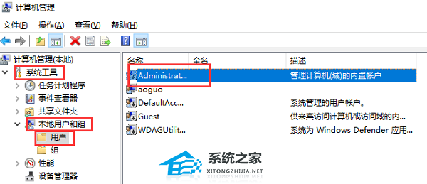 2、展开至计算机管理——系统工具——本地用户和组——用户,在右侧找到并打开Administrator。
