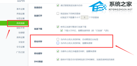 2、切换到“优化加速”页签,取消内存和磁盘占用提醒,让浏览器不要不停地检测电脑,节省资源开销。