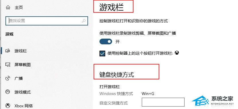3、找到游戏栏——看到键盘快捷方式——就是Xbox的快捷键。