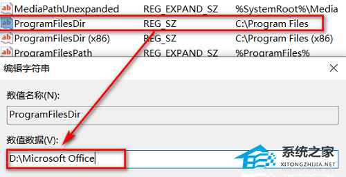3、把上面这三项注册表的值改为office安装路径,例如“D:\Microsoft Office”就将这三项注册表的值改为此路径。