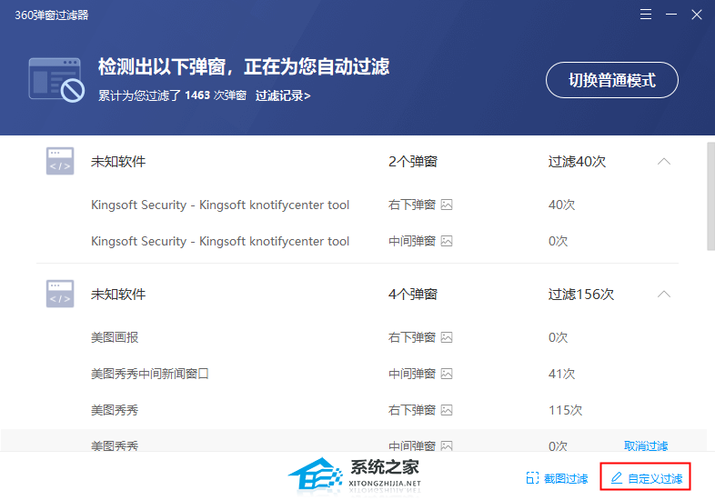 2、进入之后,你可以【自定义过滤】,将一些经常会弹窗的程序添加过滤。