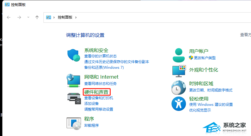 2、在控制面板里点击硬件和声音(注意右上角查看模式为类别,才可以看到硬件和声音选项)。