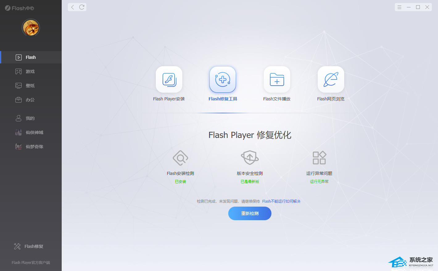 我们有时候在使用电脑的时候会被提示必要的组件未运行,请重新安装,这个时候就需要用到Flash中心来解决这个问题,但一些小伙伴还不清楚要如何操作去进行修复,其实只需要等其自动检测完进行修复即可,下面就和小编一起来看看吧。