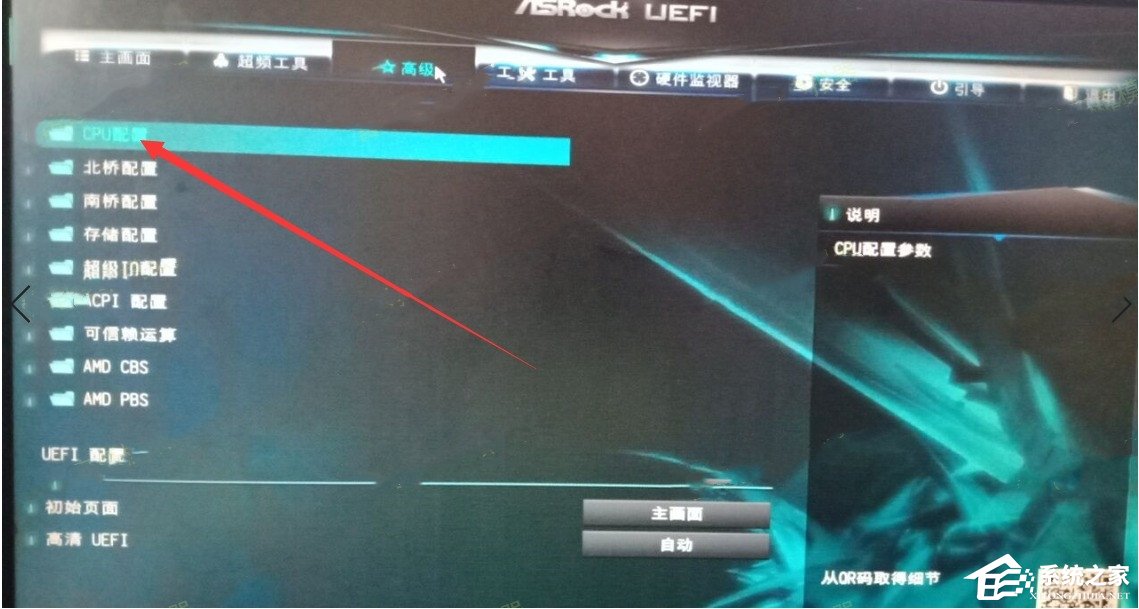 1. 进入BIOS页面后,找到“Advanced(高级)”——“CPU Configuration(CPU配置)”——“SVM MOD(虚拟化技术)”选项,把“Disabled”都修改为“Enabled”或者“禁用”修改为“启用。