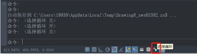 关闭这个选择集对话框的方法很简单,我们在命令行下方的状态栏中找到【选择循环】按钮点一下就可以关闭了,或者是使用快捷键Ctrl + W,如果想要开启就再重复这个操作就可以了。