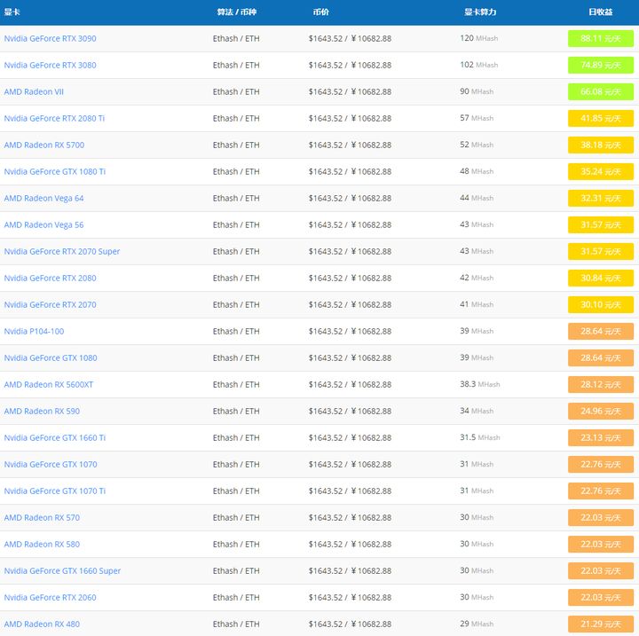 以下是目前显卡每日挖矿的收益图(以太币价格挂钩):