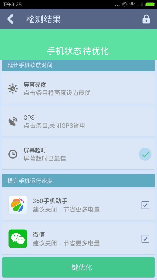 优化大师是SuperApp团队精心打造的一款可用于优化手机设置,清理后台应用的软件,通过优化蓝牙,GPS,WI-FI,APN,亮屏时间等参数,从而省电,延长手机使用时间,通过清理后台运行应用,让手机使用更加流畅,减少使用时手机内存,图形化展示运行时应用所占内存,更加直观亲切。