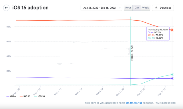 iMessage和FaceTime可能无法激活 图源:苹果官网iOS是苹果研发的移动端操作系统,最早于2007年1月问世。不久前的9月12日,苹果正式发布iOS16系统,新版本系统升级了锁屏功能,推出专注模式,信息app可以编辑、撤回消息。据分析公司Mixpanel的数据,截至9月16日,即iOS 16正式发布4天后,约有15.02%的iPhone安装了该系统。对比去年发布的iOS 15,推出4天后该系统的安装率为11.7%。这意味着今年iOS 16的推广速度更快。