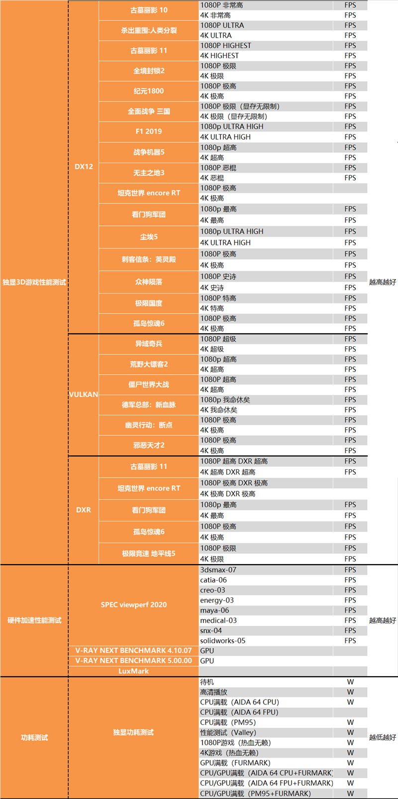 测试大致会分为以下一些部分:GPU理论性能、GPU基准测试、游戏性能测试、硬件加速测试、功耗测试。老规矩,数据量会比较大。测试项目上有一定的更新,游戏部分会包含DX9、DX11、DX12、VULKAN、DXR五个部分。