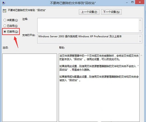 3、在“不要将删除的文件移到回收站”的界面中,如果想要删除文件后进入回收站,就选择“已禁用”,如果想要彻底删除文件而不进入回收站,那么就选择“已启用”,设置完毕之后将电脑重新启动即可。