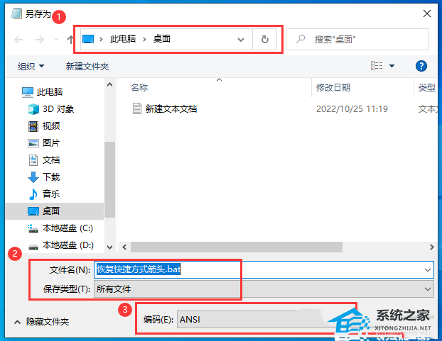 2)文件名填入以【.bat】结尾的名称,保存类型选择【所有文件】