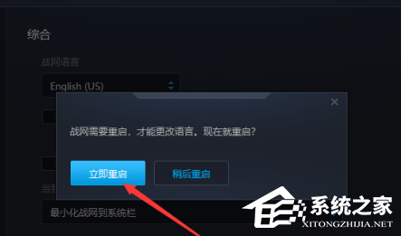 6、然而弹出更改语言的警告对话框中选择”立即重启“或”稍后重启“选项。