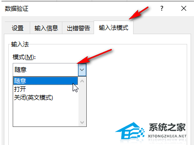第三步:进入窗口后切换到“输入法模式”栏,点击“模式”处的下拉箭头选择“随意”,然后点击“确定”;
