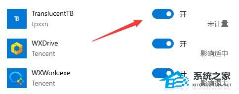 4、然后找到translucenttb这款软件,并将它设置外“开”即可开机启动了。
